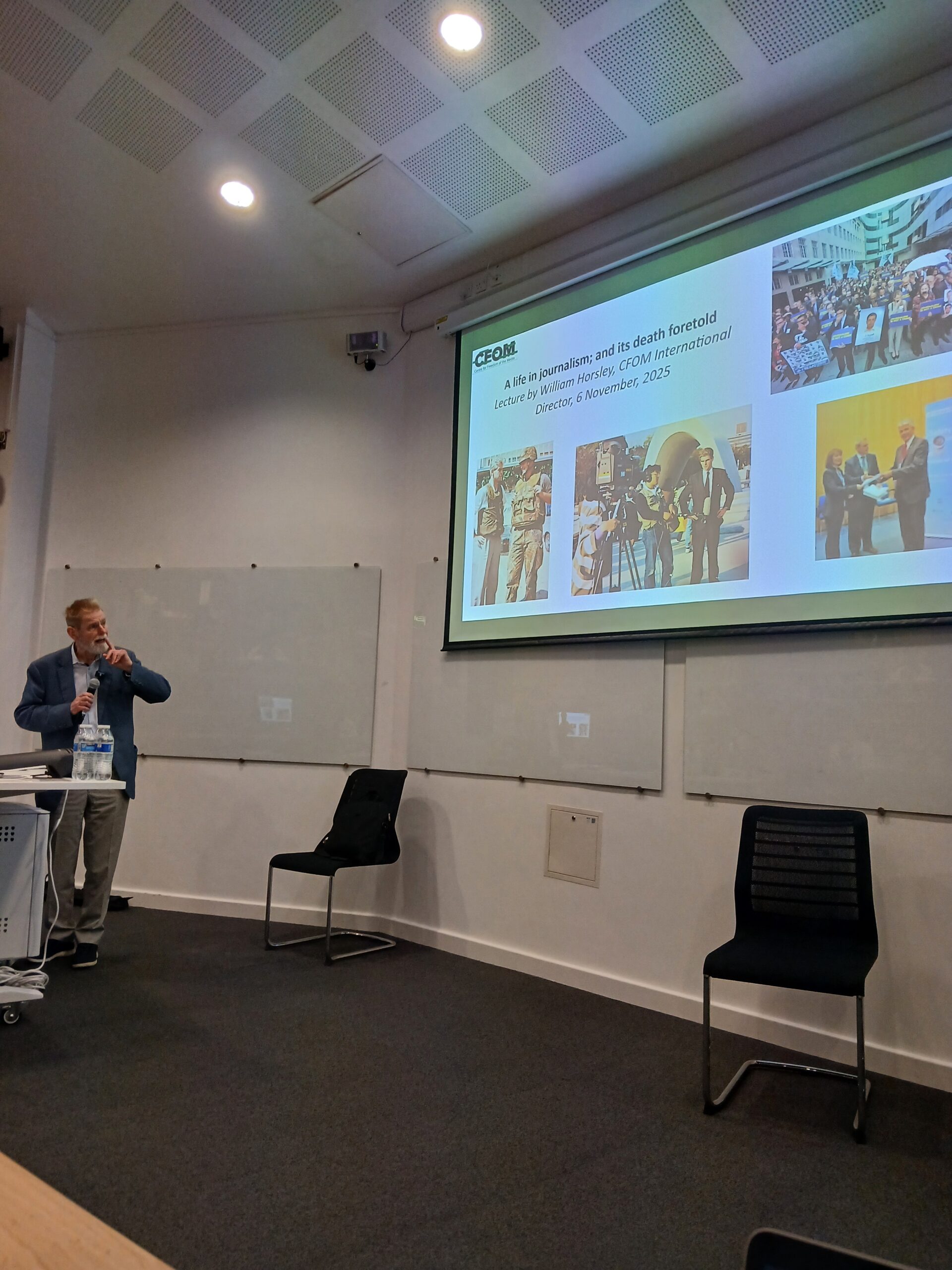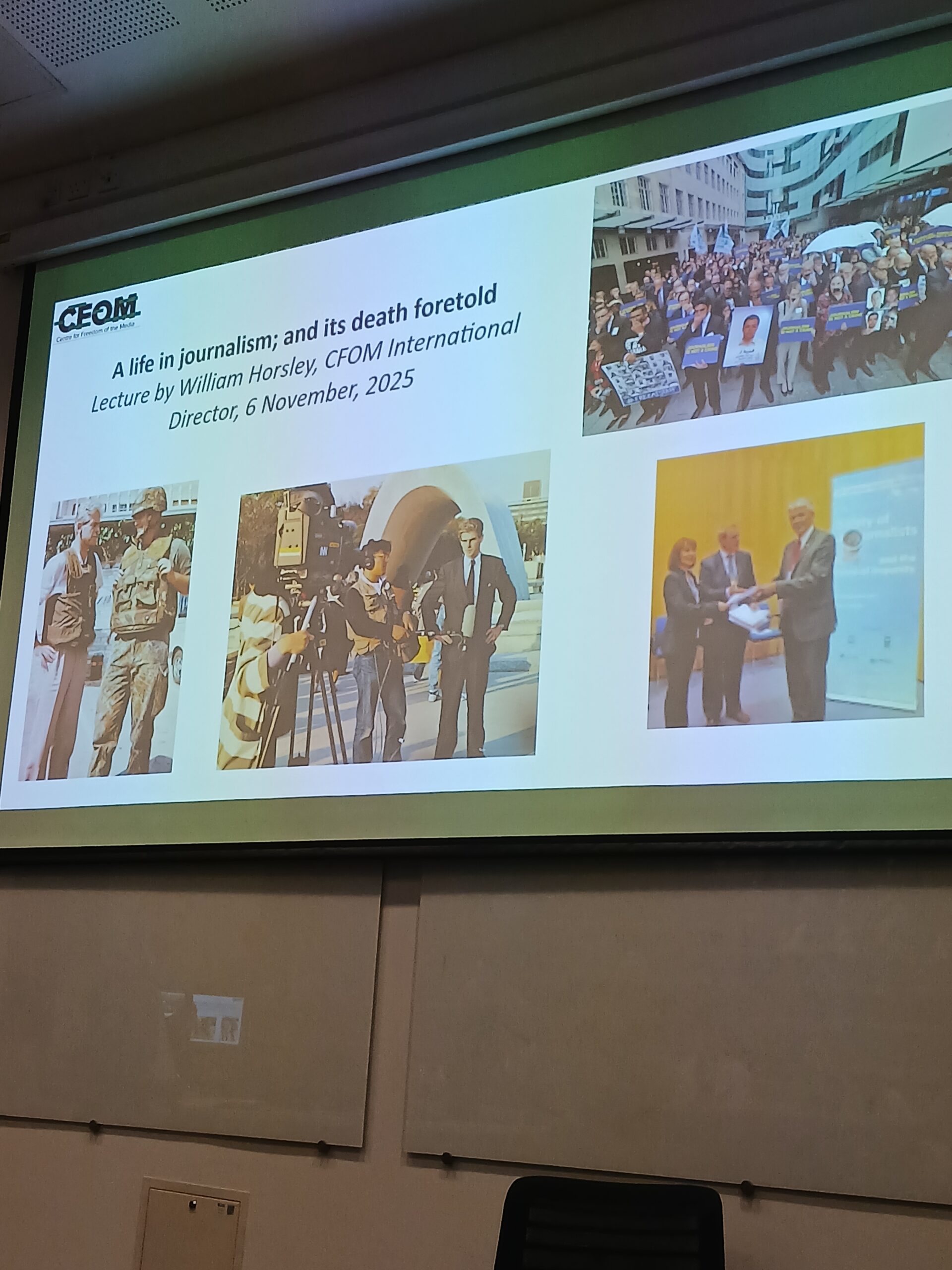 International Journalism Week took place from 3-6 November with this year’s theme focusing on Journalism in the age of drone warfare and democratic decline. CFOM hosted a panel on 6 November that focused on the challenges and opportunities posed by AI in newsrooms. Additionally, CFOM’s International Director, William Horsley, delivered his farewell lecture: ‘A life in journalism; and its death foretold’. The event was also hosted to mark International Day to End Impunity for Crimes against Journalists (IDEI).