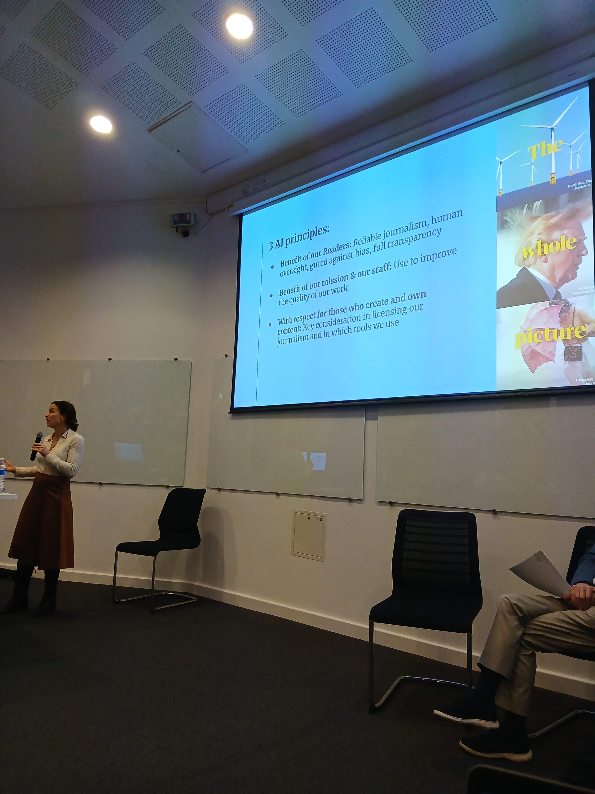 In the second part of the CFOM panel, William moderated a panel discussion: Journalism and defence of truth in an AI-shaped world. Tami Hoffman, Director of Public Policy, the Guardian, opened the panel by stating that AI is not magic, but it is important, here to stay and we can’t bury our head in the sand. She emphasised the importance of staff training on AI, but to use it as a co-pilot and not to make decisions about people. She emphasised how the human element of journalism is still of the utmost importance as people are more likely to open up and trust a journalist than AI. She also stated how organisations need to be honest with audiences about how they are using AI and demonstrated the Guardian’s practice of how to use AI.